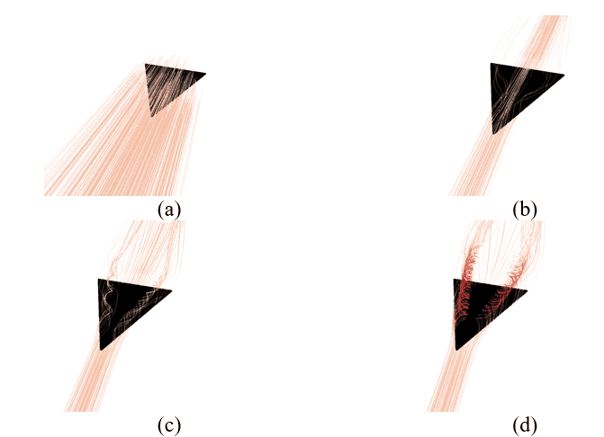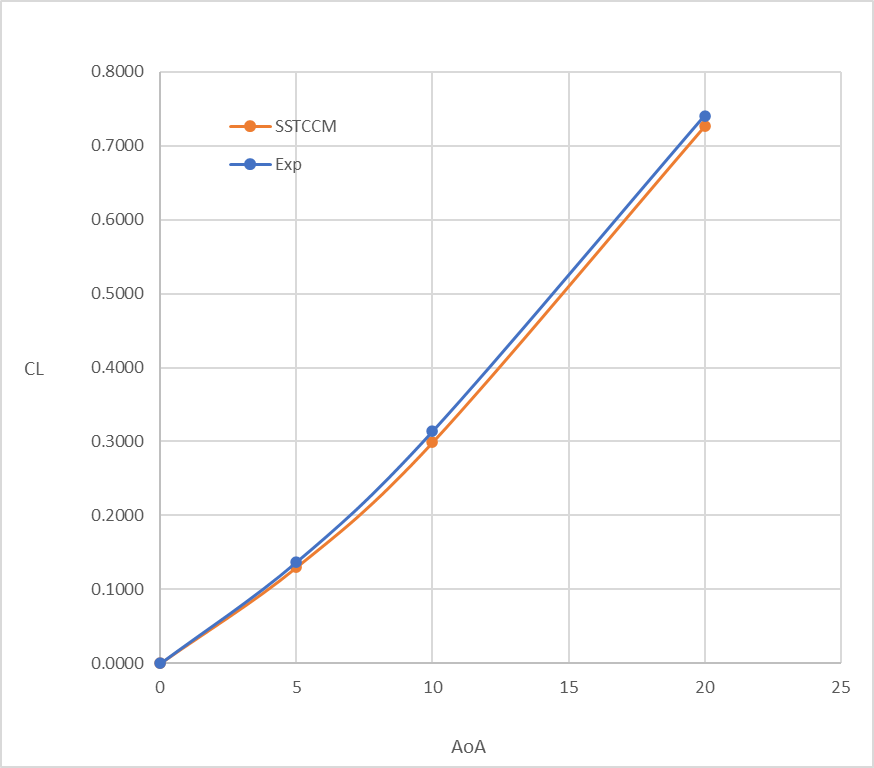 Figure 7 demonstrates the streamlines at different angles of attack, it shows the flow behaviour around the wing at different angles of attack, illustrating the progression from smooth flow to complex vortex structures. When α=0°, the flow passes over the wing without significant disturbance, and no vortex formation is observed at the wing tips due to the minimal pressure difference between the top and bottom surfaces. As the angle of attack increases (α=5°,10° and 20°), the pressure difference becomes more pronounced. This creates strong vortices at the wing tips, driven by spanwise flow and pressure gradients. These wing-tip vortices become stronger with increasing α, indicating the growing influence of rotational flow features. The SSTCCM successfully captures these phenomena, including the transition from smooth flow to vortex formation, highlighting its effectiveness in modelling swirling and rotational flows. These results are crucial for understanding aerodynamic behaviour, particularly in evaluating the role of wing-tip vortices, which contribute to induced drag and significantly affect the aerodynamic performance of the wing.