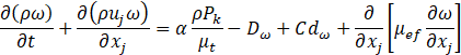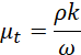 Equation (6) combined both the normal and the shear stress of Reynolds stress tensor. Solving the term μt will close the RANS model given in equations (4) and (5). Therefore, μt is calculated based on the turbulent kinetic energy k, and the turbulent dissipation rate ω using the following formula:
