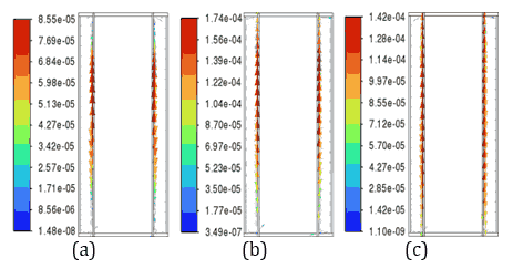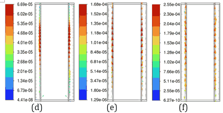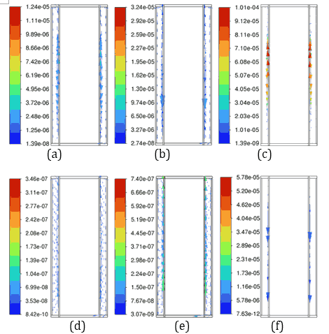 Figure 6 depicts velocity vector fields, highlighting that the fluid velocity within the 4 mm PCM is lower as PCM in 4 mm thickness melts less, whereas the 3 mm PCM shows higher velocity magnitudes, reflecting more active phase change dynamics due to a higher amount PCM in the molten state. These observations underline the trade-off between thermal uniformity and latent heat utilization, with the 4 mm PCM providing better thermal regulation and the 3 mm PCM demonstrating higher phase change efficiency. The 4 mm PCM layers of n-Heneicosane, OM42, and n-Docosane exhibit lower internal fluid velocities during discharge, as shown in Figure 6, indicating limited convection from partial melting. This reduced flow retains a low liquid fraction, reducing convection-driven heat transfer. In contrast, the 3 mm layers show complete melting, resulting in higher fluid motion and steeper temperature gradients, as illustrated in Figure 5. This suggests that thicker PCM layers are more effective at temperature control, but do not fully utilize their latent heat capacity for the 5C discharging rate. Considering the balance between temperature regulation and effective material utilization, the 3 mm PCM thickness emerges as the optimal choice across all three materials.