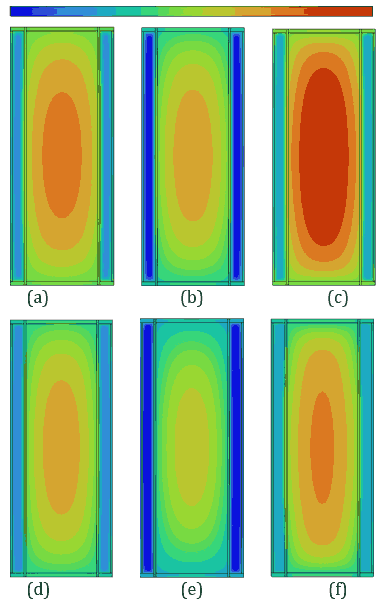 Figures 8 and 9 illustrate temperature and velocity vector contours, respectively, on the cross-sectional plane B-B' for ambient temperatures of 30 °C and 35 °C during a 5C discharging cycle with a 3 mm PCM thickness and a convective heat transfer coefficient of ℎ=20 W/m²·K. Figure 8 shows the temperature contours, where the temperature of the battery has increased significantly at 35 °C compared to 30 °C, resulting in higher temperature gradients across the PCM and battery.
