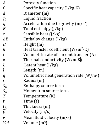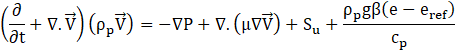 where the velocity vector, The source term Su is used to model fluid flow during phase change. β is a thermal expansion coefficient and eref is a reference value of the sensible heat. Sh is a phase related source term. The liquid fraction of PCM is expressed as,