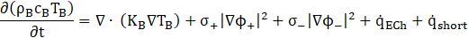 The thermal performance of the battery is simulated using the Newman-Tiedemann-Gu-Kim (NTGK) model. The governing equations for the thermal and electrical energy conservation within the battery are solved using a Multi-Scale Multi-Domain (MSMD) approach [8]. The governing equations for current flux at both the positive and negative electrodes are detailed as [15], [16].