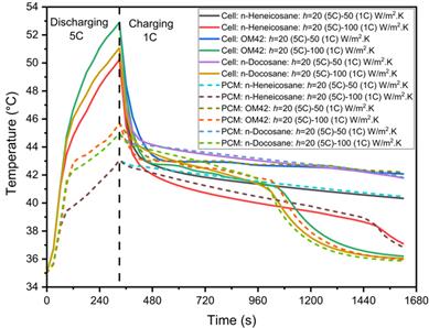 The selected PCMs, n-Heneicosane, OM42, and n-Docosane, are chosen for their melting points and thermal properties, optimal for maintaining battery temperature during high-rate discharging and charging cycle of 5C-1C configuration. The performance of battery-PCM configuration is examined under heat transfer coefficients ranging from 20 to 500 W/m²·K. The specifications and properties of the battery can be found in [13]. The thermophysical properties of PCMs are listed in Table 3.