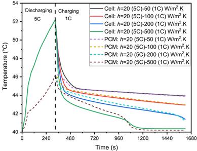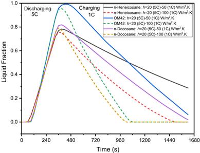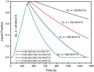 Following the discharging phase, the 1C charging process begins, and Figure 11(a) demonstrates the usefulness of a higher heat transfer coefficient in achieving complete solidification. At h=50 and 100 W/m²·K, the PCM does not fully solidify at the end of the charging cycle, as indicated by the higher temperatures and liquid fraction seen in Figure 11(b). Consequently, higher heat transfer coefficients of h=200 and 500 W/m²·K are applied, resulting in rapid temperature decrease and complete solidification of n-Docosane. The time required for solidification is significantly reduced, with h = 200 W/m²·K achieving solidification in 1290 s and h = 500 W/m²·K in 750 s. This outcome demonstrates the importance of optimizing convective heat transfer in maintaining effective thermal management under extreme conditions.