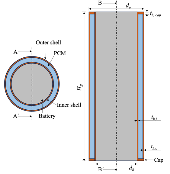 The study utilizes a SAMSUNG ICR 18650-26J Lithium-ion battery with a nominal capacity of 2600 mAh. Figure 1 illustrates the battery structure, which includes an 18 mm diameter core encased by a 0.5 mm thick inner copper shell. This core-shell assembly is then surrounded by a 3 mm layer of PCM and further protected by a 0.5 mm outer copper shell. Additionally, both the top and bottom of the battery are fitted with 1 mm thick caps. Table 1 details the battery's operating parameters, while Table 2 lists material properties, such as thermal conductivity, that affect heat dissipation in lithium-ion batteries.