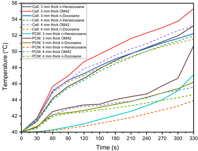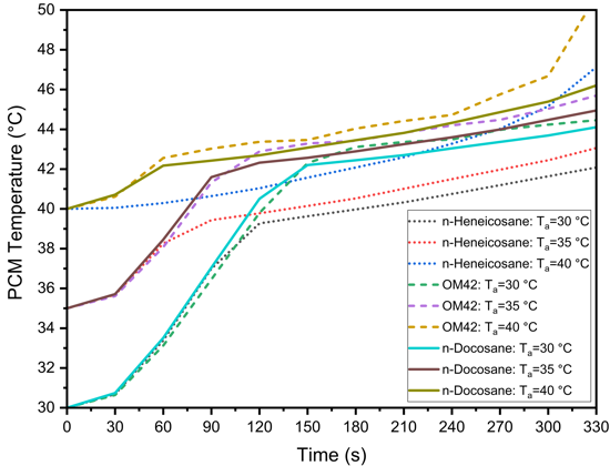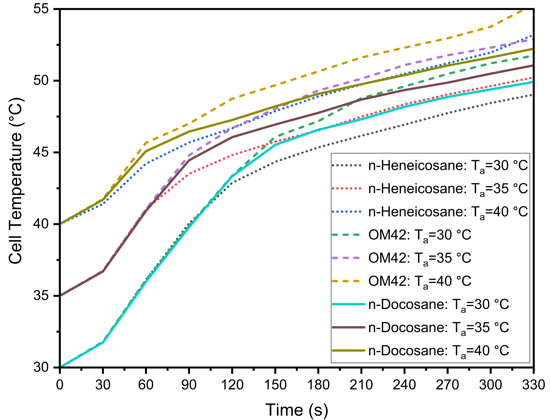 The performance of PCMs in managing the thermal behaviour of LIBs is highly sensitive to changes in ambient temperature. Figure 7 presents the effect of ambient temperature on the thermal management performance of n-Heneicosane, OM42, and n-Docosane during a 5C discharging cycle, with a PCM thickness of 3 mm and h=20 W/m²·K. In Figure 7(a), the cell temperature profiles indicate that as the ambient temperature increases from 30 °C to 40 °C, the maximum cell temperature rises for all PCMs. OM42 results in the highest cell temperatures across all ambient conditions, as the melting of the PCM occurs at 43 °C. For ambient temperatures of 30 °C and 35 °C, the maximum cell temperature is consistently higher for n-Docosane than n-Heneicosane. The n-Heneicosane has the highest latent heat of fusion and the lowest initiation of melting temperature, which causes longer stabilization time at the lower PCM temperature. However, for ambient temperatures of 40 °C, the maximum cell temperature is higher for n-Heneicosane at 330 s, whereas it is lower at 180 s. This can be attributed to the earlier completion of melting of partially melted n-Heneicosane at an ambient temperature of 40 °C, leading to a rapid rise in the cell temperature at around 270 s.
