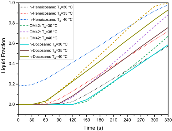The maximum melting fraction reaches 57.41%, 72.02%, and 98.01% for n-Heneicosane; 67.13%, 88.09%, and 100% for OM42; and 58.73%, 75.70%, and 93.04% for n-Docosane at ambient temperatures of 30 °C, 35 °C, and 40 °C, respectively. As expected, higher ambient temperatures lead to greater PCM melting, with OM42 achieving complete melting at 40 °C, which correlates with its higher cell and PCM temperatures observed earlier. Among the PCMs tested, n-Docosane demonstrates the most consistent performance across the different ambient temperatures, maintaining lower cell and PCM temperatures under the most extreme conditions.