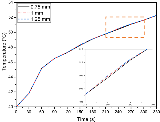 Mesh size independence is essential for ensuring convergence and accuracy in numerical simulations and that the solution remains unaffected by variations in mesh discretization. For a discharge rate of 5C at an ambient temperature of 40 °C and a convective heat transfer coefficient of 20 W/m²·K using n-Docosane, grid independence is evaluated with three element sizes: 1.25 mm, 1 mm, and 0.75 mm. The corresponding mesh counts for the battery with a PCM thickness of 3 mm are 46,632, 66,585, and 132,792, respectively, as illustrated in Figure 2(a). Minimal differences in the results led to the selection of a 0.75 mm element size as optimal for the PCM-integrated setup.