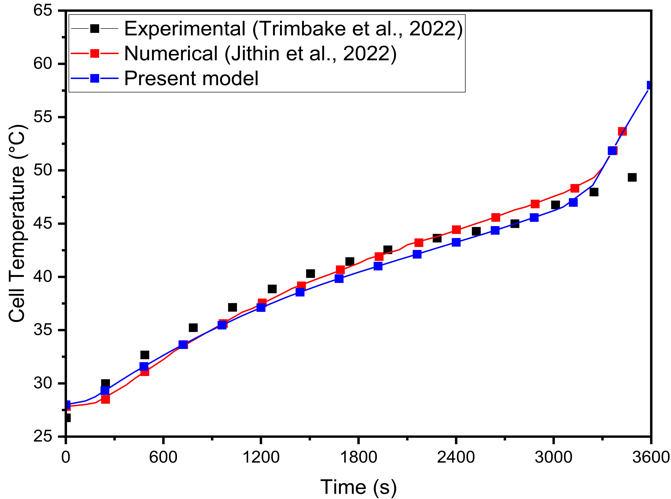Figure 3(a) compares the battery's cell temperature over time using experimental and numerical data. Temperature measurements reveal a distinct pattern: a rapid initial rise, a gradual increase, and a final spike, which is accurately predicted by the present numerical model. The numerical results closely match the experimental data, with maximum deviations of 11.48% and 2.95% compared to Trimbake et al. [17] and Jithin et al. [13], respectively.
