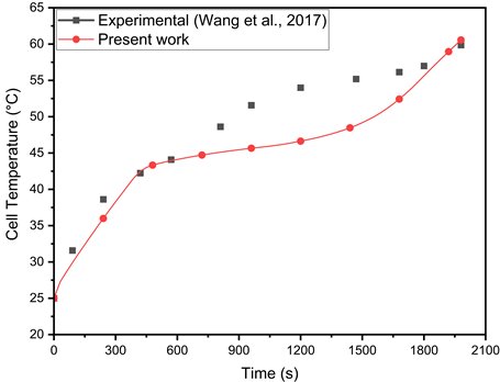The present numerical model is based on the NTGK model and is validated against the experimental study by Trimbake et al. [17] and the numerical analysis by Jithin et al. [13]. Both studies investigate a Samsung 26J 18650 2600 mAh battery pack in a 4S1P configuration. The experiments discharged the batteries at 2C (5.2 A) and 1C (2.6 A) using a 200 W electronic load, focusing on a 1C discharge scenario with h=5 W/m²·K.