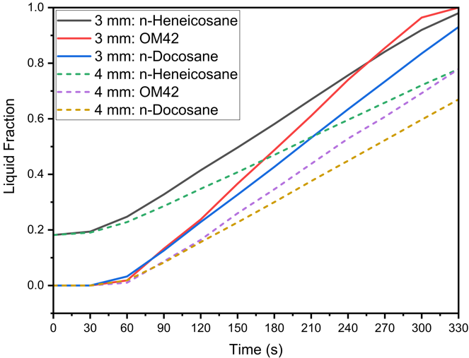 Therefore, the OM42 shows a higher melt fraction at the end of the discharging process of 330 s owing to a lower single melting temperature (43 °C) and the lowest latent heat of fusion (∼40% lower than n-Heneicosane) among the three PCMs, leading to earlier melting. Furthermore, the OM42 temperature during discharging remains consistently higher than n-Heneicosane and n-Docosane as the melting initiates at a higher temperature. It can be noted that n-Heneicosane and n-Docosane melt over a range of temperatures, and the melting starts earlier than OM42. Hence, the cell temperature for OM42 is significantly higher compared to the other two PCMs. However, it is further observed that the cell temperature for n-Heneicosane is higher compared to that of n-Docosane at 330 s, whereas the opposite trend is observed at 180 s for both the cases of 3 mm and 4 mm PCM thicknesses. This is because n-Heneicosane has a lower completion melting temperature of 43.6 °C than n-Docosane (44.7 °C). As a result, n-Heneicosane melts completely slightly before 330 s, leading to higher cell temperature. However, at 180 s, the PCM temperature of n-Heneicosane is lower than that of n-Docosane, as the initiation of melting of n-Heneicosane is significantly earlier (39.2 °C) compared to n-Docosane (42.1 °C), which maintains the cell temperature lower, as can be seen in Figure 4(a). This can also be seen from the temperature contour plots presented later.