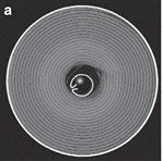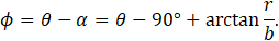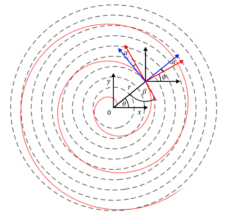 where b defines the gap between the spiral layers. The angle β can be obtained from the formula of the angle between a tangential of the spiral and radius vector as