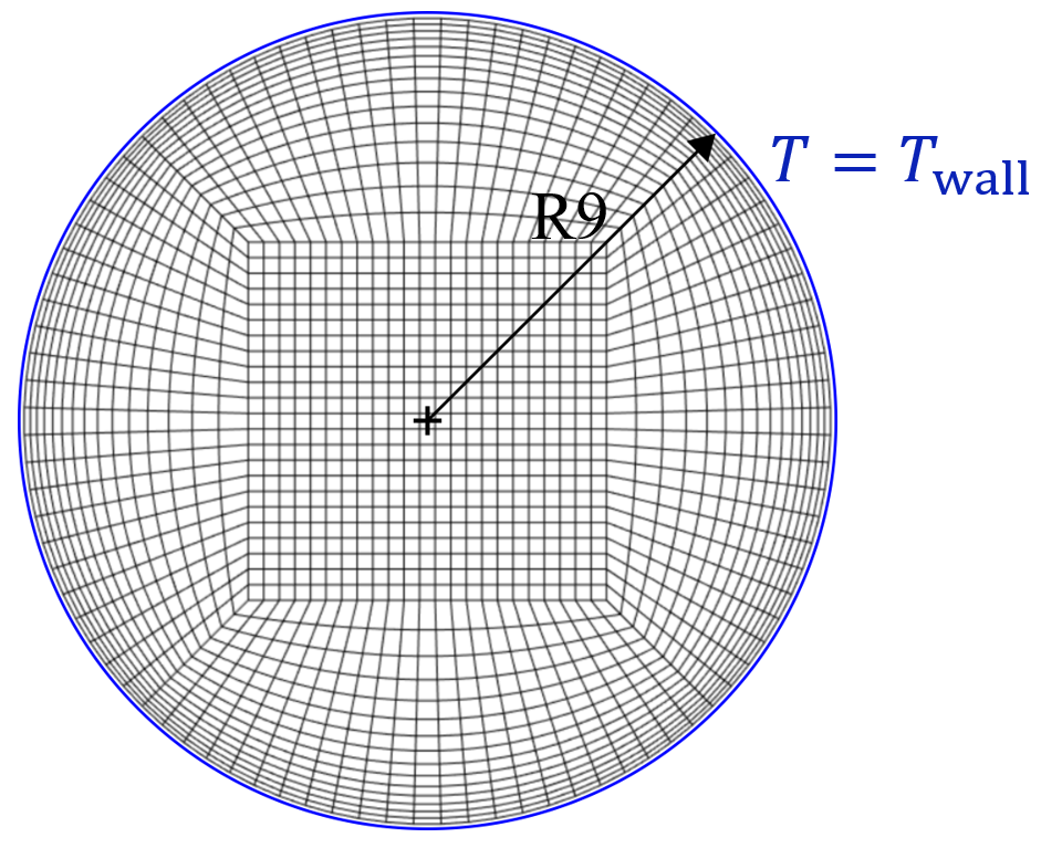 The computational domain consists of a cylinder with a radius of 9 mm (ro) representing an 18650 Li-Ion cell, the cross-sectional slice with mesh is displayed in Figure 2. There are around 1800 elements in the slice; almost 85 % of the elements have a skewness lower than 0.10, and the average skewness is 0.06; the aspect ratio of the elements is not higher than 6.70, and the average value is 2.21. The case can be solved only in two-dimensional space x,y as heat transfer in the z-direction is trivial and is not connected with the primary goal of the present manuscript to test the influence of the spiral geometry on heat transfer. However, the equations and transformations are stated in three-dimensional space for their general usage. The Dirichlet boundary condition is set on the outer diameter of a cylinder with a constant wall temperature (Twall) of 320 K. Steady state is assumed. This setting can simulate the case when a Li-Ion cell is discharging/charging at low current and immersed in a phase change material with a melting point of Twall.