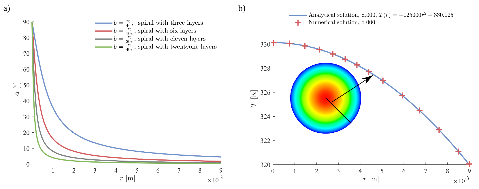 The resulting angle α is shown in Fig. 4 a), for four different b. In practice, actual values of b are somewhat lower than r0/(20π) m, i.e., the spiral has more than eleven layers. For these cases, it can be seen that if the radius is higher than 1 mm, the angle α is lower than 8°. Hence, the difference between the constant and variable conductivity (based on the spiral structure) is minor, and no significant temperature difference is expected for cases with varying thermal conductivity with radius.