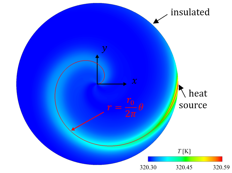 applied to the same domain (as shown in Fig. 2) of a circle with a radius of 9 mm. Here, S is zero everywhere except in the vicinity of the point [9⋅10-3,0], where it is set to 10 MW⋅m-3 within a radius of 0.5 ⋅ 10-4m. All boundary conditions are adiabatic. Additionally, assume the radial thermal conductivity is zero while the tangential thermal conductivity is 30 W·m−1·K−1. Let us analyze the case for a one-turn spiral, i.e. b= r_0/(1⋅2π) ending in point [9⋅10-3,0]. After the initialization and the first time-step of 0.001 seconds, a heat diffuse along the spiral can be observed (Fig. 5) as expected from the preceding description.