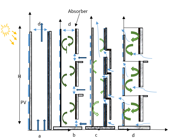 The objective of this study is to assess the impact of air circulation on the three pioneering types of vertical solar chimneys that can be incorporated into a multi-story structure. They comprise a PV/T collector with a H-shaped configuration. The solar chimney features three distinct levels of fresh air intake. The second chimney comprises a shunt duct of width d₂ which allows the introduction of fresh air into the main duct of width d₁, thus enabling the removal of excess heat from the solar cells. The third chimney is equipped with three inlets and three outlets. A comparative analysis will be conducted to examine the thermal and electrical performance of the three chimney types under consideration and evaluate their relative efficacy in comparison to a traditional vertical chimney. To extract the surplus heat produced by the solar cells, air is utilized as the heat transfer medium in the main channel. A two-dimensional (2D) transient laminar mixed convection model has been postulated. The transfer equations were formulated on the assumption that the thermophysical properties of the air remain constant and that the fluid is incompressible. The Boussinesq approximation was employed.