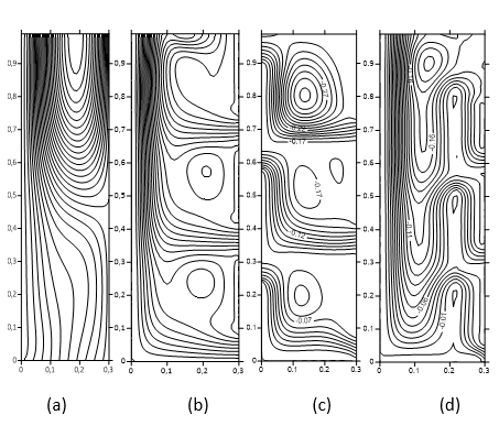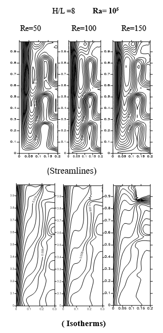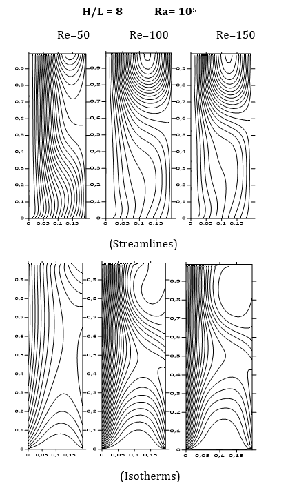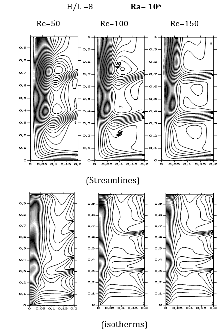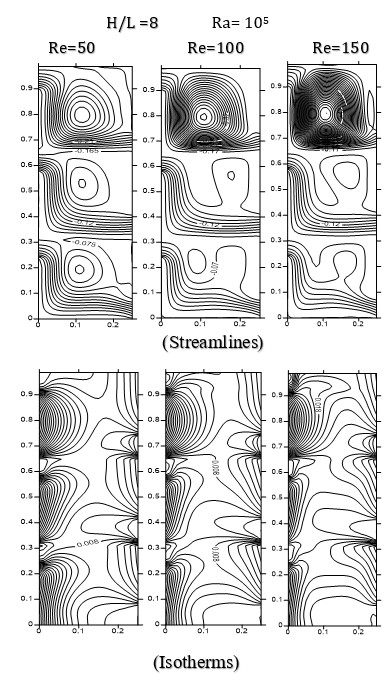 The structure of the streamlines and the temperature distribution are presented for an aspect ratio (B=H/d) equal to 8, to facilitate analysis of the aforementioned parameters. The streamlines and isotherms are depicted for steady-state flows obtained for a fixed Rayleigh number (Ra) = 105, with the Reynolds number fixed at 100. Figure 3 illustrates the direction and velocity of airflow within each stacked model, as indicated by the streamlines.
