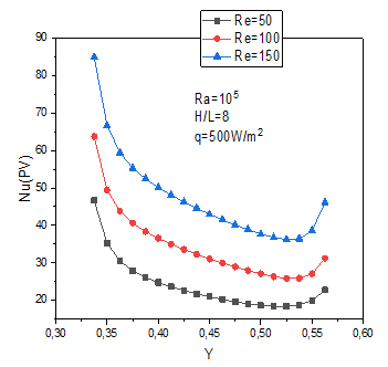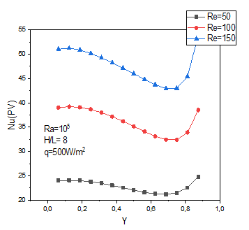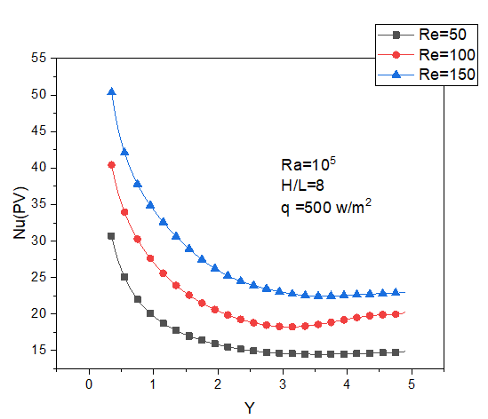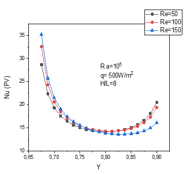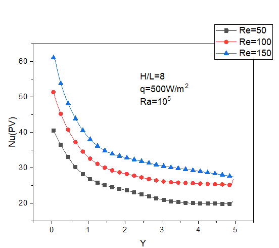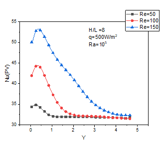The impact of Reynolds number (Re) on thermal performance is explored through the analysis of Figures 10 to 14. Figures 9, 10 and 11 show the variation in the local Nusselt number (Nu) for the separate stack at different Re levels. At low Re, Nu is relatively low, indicating limited heat transfer. However, at Re=150, Nu increases considerably, especially at the third level, indicating improved convection and heat dissipation due to flow segmentation. Figure 12 illustrates a similar phenomenon for the combined stack, where increasing Re improves convection, resulting in higher Nu. This is due to the increased interaction between the air and the hot surfaces (absorbers). Figure 13 shows the evolution of Nu in the simple stack, where the effect of Re is observable, but with lower Nu values compared with the other configurations. Finally, Figure 14 shows the best performance for the shunt stack, where the increase in Re allows the flow to be concentrated in specific areas, maximising the Nu and improving the cooling of the PV panels. In summary, these figures show that increasing Re improves heat transfer, with optimum performance in both the combined and shunt configurations.