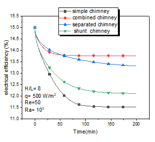 Figure 15 shows that the electrical efficiency of photovoltaic (PV) panels is strongly influenced by cell temperature, which in turn depends on the heat dissipation performance of each chimney. In the case of the simple chimney, the electrical efficiency decreases in the middle of the day, when temperatures reach their maximum. This loss of efficiency, which can be as much as 8%, results from insufficient heat dissipation. Thanks to a better interaction between the airflow and the heat absorbers, the combined chimney maintains a more stable electrical efficiency, with an increase of 5-8% compared with the simple chimney. The segmentation of the flow reduces hot spots, ensuring greater thermal stability. Electrical efficiency is improved by 4-7% compared with the simple chimney. Flexible flow management keeps panel temperatures at an optimum level. Electrical efficiency is maximised, with an increase of 6-10% compared with the simple configuration.