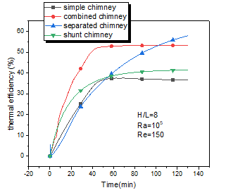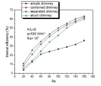 Figure 17 shows that thermal efficiency increases with Reynolds number (Re), reflecting more intense forced convection. The single stack remains limited, with an efficiency of less than 55% at Re=150. The combined stack reaches over 70%, thanks to better convection around the absorbers. The separate chimney offers stable efficiency at 65%, giving priority to thermal homogeneity. Finally, the shunt chimney achieves the best performance, with 75% Re=150, thanks to optimized flow management in critical areas.