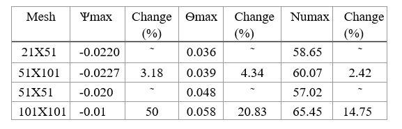 The objective is to reduce the mesh's influence on the simulation's accuracy. To achieve this, mesh-independent solutions are ensured by comparing different meshes, with the highest Rayleigh and Reynolds numbers used in the present work (Ra = 3.105 and Re = 150) taken into account. As illustrated in Table 1, minor deviations are observed in the characteristic quantities Ѱ, Ѳ, and Nu for non-uniform 21x51 and 51x101 meshes, compared to their uniform counterparts, the 51x51 and 101x101 meshes. Adopting a heterogeneous mesh configuration allows for the optimization of resolution, thereby facilitating a superior geometric representation of the model. This approach also serves to reduce numerical errors and enhance computational efficiency. However, the 51x101 mesh was selected due to its enhanced efficiency in heat transfer in comparison to the 21x51 mesh, as indicated by a 2.48% augmentation in the Nusselt number. The data about the electrical and thermo-optical properties of the walls used in the computations are presented in Table 2.