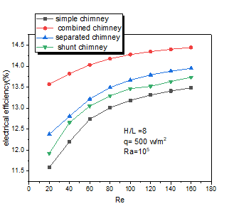 Figure 18 shows that the electrical efficiency of PV panels increases with Re, thanks to better heat dissipation. The single stack is limited to 10% at Re=150, while the combined stack achieves 14% thanks to a significant reduction in panel temperature. The separated chimney offers 13% efficiency with homogeneous dissipation, and the shunt chimney, the highest-performing chimney, achieves 15% by optimizing flow management for efficient cooling.