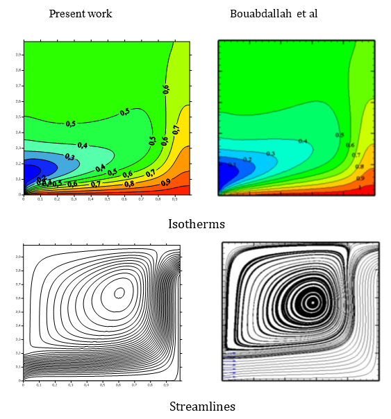 The developed calculation code was tested by presenting the stationary laminar mixed convection problem in a ventilated square cavity. The aforementioned cavity is furnished with an air inlet and an air outlet and is filled with air (Pr = 0.71). One wall of the cavity is maintained at a constant temperature, Tc (the bottom wall), while the remaining walls are treated as adiabatic boundaries. The solution of the test problem exhibits a high degree of agreement with the solutions of the ventilated cavity, as reported by Bouabdallah et al. [24], for a Grashof number fixed at 105 and a Richardson number fixed at 20. The results are presented in Figure 2.