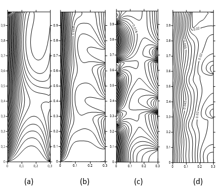 The simplest of the aforementioned stacks is represented by the diagram labeled 'a. The streamlines are predominantly vertical, indicating a steady ascent of air. The lack of divergence in the flow lines indicates the presence of an unidirectional and uniform airflow, with velocity dependent on the temperature differential. In the Combined stack (b), the streamlines are influenced by the presence of photovoltaic panels and a thermal absorber plate, which increase the air temperature and accelerate the airflow. The intensification of the circulation near the heat transfer surfaces is evident from the flow lines. Whereas a separated chimney is represented by symbol (c); the airflow is distributed across multiple sections, facilitating enhanced regulation of the ventilation process. This model incorporates a variation in flow between the different sections, facilitating the regulation of airflow velocity as required. Then, the fourth shunt is designated as Shunt Stack (d). As shown in the flow lines, the air is partially diverted, contingent on the desired ventilation conditions. The shunt enables the main flow to be diverted, which may be beneficial for regulating the pressure and temperature within the chimney. This model provides the flexibility required for the management of draughts. As illustrated in Figure 4, the temperature distributions within the different chimney types can be visualized using the isotherms presented therein. In the simple chimney (a), the isotherms display a high level of parallelism along the length of the chimney, indicating a gradual increase in air temperature by elevation. The rate of ascent of the airstream is directly proportional to the temperature difference between the base and the top of the chimney.