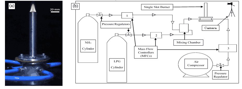 In the present study, the flame stability of ammonia and LPG blends is characterized by establishing a canonical diffusion and partially premixed flames in a newly designed and fabricated single slot Bunsen burner. The burner tube made up of stainless steel has internal diameter and length of 17.34 mm and 15 cm, respectively. The inner diameter of the burner is chosen such that the Reynolds’ number for the flows inside the tube are well within the laminar regime. The tube length is selected such that the flow is fully developed as it comes out of the burner. A thickness of 1.83 mm is used to ensure optimal heat dissipation. The burner is provided with four inlets around the periphery of the settling chamber. The photographic image of the Bunsen burner and the schematic of the experimental setup are shown in the Figs. 1.1 and 1.2, respectively. The fuel cylinders of commercial LPG and ammonia (purity 99.99%) supplies fuel to the burner and the flow rates of each fuel are controlled using respective Mass Flow Controllers (MFC1 and MFC2). The outlets of the LPG and ammonia MFCs deliver the required fuel flow rates and are connected directly to a settling (or mixing) chamber through the flexible pneumatic pipes. The air used in the experiments are drawn from the main compressor line. The flow rate of air is controlled using MFC3 before it is allowed to mix with the fuel. All the flow rates of ammonia, LPG and air are regulated using Alicat MFC with 0.5% of reading accuracy. The flame photographs are captured with the help of a high-speed camera (EOS M50 Mark II).