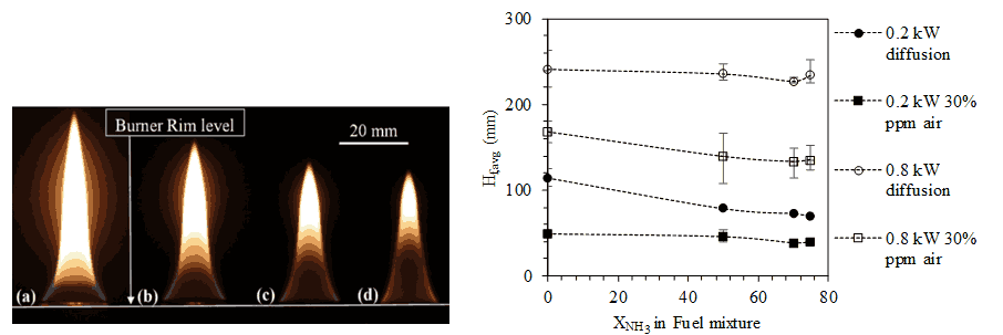 (i) Steady diffusion flames of lower power rating 0.1 kW are established with varying NH3 mole fraction till as high as 0.8 in fuel mixture. It is observed that on increasing NH3 in the fuel mixture for steady flames, there is a decrease in flame length, shortening of the luminous sooty zone and an increase in length of the non-luminous zone.