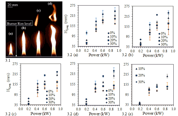 The time averaged visible flame heights are experimentally measured using the help of a camera for different compositions of fuel mixture, power ratings and percentages of partial premixing. For a given fuel mixture composition, they are plotted (Figure 3.2 (a)-(e)) against different power ratings and percentages of partial premixing. The average flame length increases with power rating when fuel mixture composition and percentage of partial premixing remains the same. It can also be noted that the increase in flame length with power rating is more pronounced for diffusion cases than partially premixed cases. For example, in Figure 3.2(e), the flame height increases by approximately 300% for 10% partially premixed cases as compared to 240% for 30% partially premixed cases.