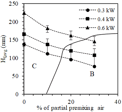 Different regimes (steady, oscillating tips and vortex shedding) of flames are observed for different combinations of power rating, fuel mixture composition and degrees of partial premixing with air. Thus, it is important to develop a stability map (shown in Figure 5) which demarcates the stability regime in which the flame