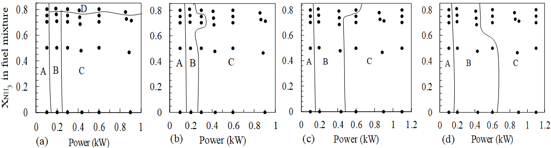 (ii) Stability maps are plotted for different configurations of fuel compositions, power ratings and percentages of partial premixing. This identifies four stability regimes among flames—(A) steady flames, (B) flames with oscillating tip, (C) flames with vortex shedding and, (D) unstable flames with lift-off. As power rating is increased, flames transition from being at regimes A to B and finally C. All diffusion flames except for 0.1 kW, with 80% ammonia (by volume) in the fuel mixture lie in regime D.