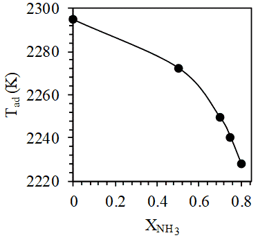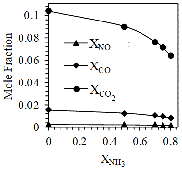 (vi) At constant pressure for one mole of fuel mixture, the adiabatic flame temperature, mole fractions of CO and CO2 in product mixture decreases with increase in mole fraction NH3 in the fuel mixture.