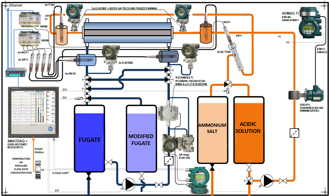 The membrane contactor was constructed with two pipeline routes, where the interfacial contact between phases was realized inside the membrane module. This module featured a bundle of 1380 polypropylene (PP) hollow-fibre membranes, each with a length of 700 mm and pore sizes ranging from 100 to 200 nm. Figure 1 illustrates the hollow‑fibre membranes, including the potting system used to secure and seal the bundle inside the membrane module. The design allowed wastewater to flow outside the fibres, as the coarse particles in the digestate exceed the fibre’s inner diameter, potentially causing clogging. Inside the fibres, an analytical acidic solution was circulated. Sensors were installed on both routes to monitor key operating conditions (pH, temperature, flow rate, pressure), as shown in Figure 2. These sensors were connected to a Memograph M RSG45 datalogger streamlined data analysis. The experiments focused on evaluating the effect of increased pH, temperature and different initial concentrations of ammonia nitrogen. The flow of wastewater was ensured by a diaphragm pump and a centrifugal pump for acidic solution.