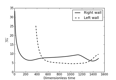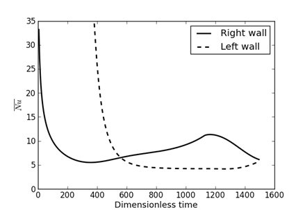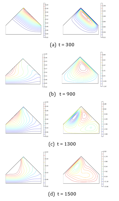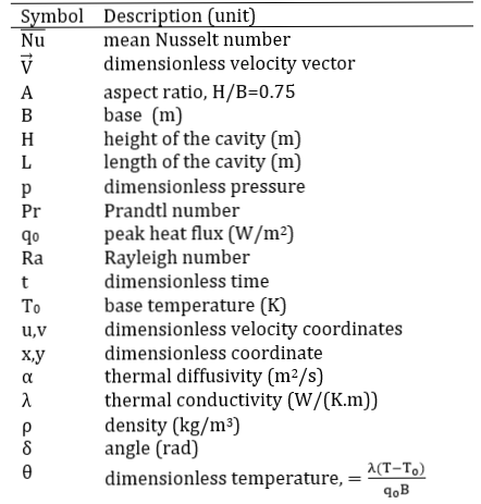 The fundamental aim of this study is to determine how the system evolves. The fact that the walls are subjected to constant or variable temperatures suggests that the system is evolving toward a quasi-stationary state [22] or oscillating periodically [23],[24]. However, by subjecting the inclined walls to sinusoidal temperatures, Saha et al. [24] numerically demonstrated that the flow is not stable. Since geometry affects the direction of transfer and modifies fluid dynamics [25],[26], this study also aims to identify the thermal buoyancy forces, whose direction depends on the orientation of the heat flux density.