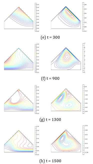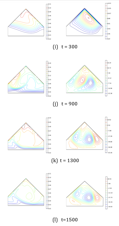 Additionally, near the left inclined wall, which increasingly receives the heat flux, thermal buoyancy forces are created, leading to the development of a counter-rotating convective cell. The main cell, thus trapped, disappears (see Figures 7c,d for Ra = 5×10⁶, for example) in favor of secondary cells. The system reorganizes, and the flow, with several cores, tends to become a monocellular counter-rotating flow, due to the relaxation of the right inclined wall (see Figures 8f-h for Ra=107). The multicellular nature of the flow appears after a relatively longer period when the Rayleigh number is low. Thus, the transition to a multicellular regime is observed at times t = 900 (see Figure 7b,c) and t = 300 (see Figures 9i,o), respectively for Rayleigh numbers Ra = 5×10⁶ and Ra = 10⁸.