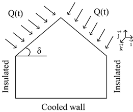 This study deals with the cavity with the right pentagonal section as shown in Figure 1a, b. The sloped walls are subjected to variable heat flux described in Figure 3. The vertical walls are thermally insulated, while the bottom wall is kept at the lowest isotherm T0. Then, we have the geometric configuration of an air-filled habitat.