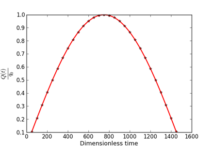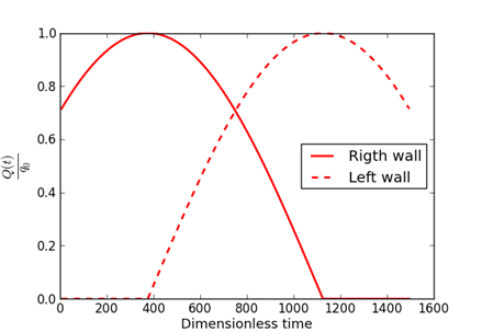 Therefore, the variations observed according to the east-west tilt of the surfaces (Figure 3.), show that the concept of directed flux or the thermal screen effect is taken into account in this study. The left inclined wall starts receiving solar radiation at t1=375, which corresponds to the peak flux received by the right inclined wall. At the median time tm=750, both walls receive the same amount of solar radiation. The peak for the left inclined wall is reached at t2= 1125 when the radiation on the right wall becomes zero.