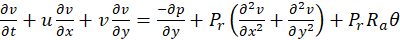 The reference quantities used to obtain the above equations are B, B2/α, BQ/λ et ρα2/B2 , which represent the base length, velocity, temperature difference, and pressure, respectively. In the equations (6) and (7), the dimensionless numbers of Prandtl, Pr, and Rayleigh, Ra, appear. The initial and boundary conditions are translated as follows: