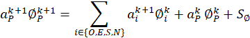 We used the power-law scheme of Patankar [33],[34] and an implicit decentred Euler scheme with a staggered mesh, to calculate the coefficients for each algebraic equation. Knowing the pressure field is essential for determining the velocity field. We decoupled velocity from pressure using the SIMPLER algorithm. The algebraic equations obtained for each quantity ∅ calculated at the node P, surrounded by the cardinal neighbors O, E, S, and N, are: