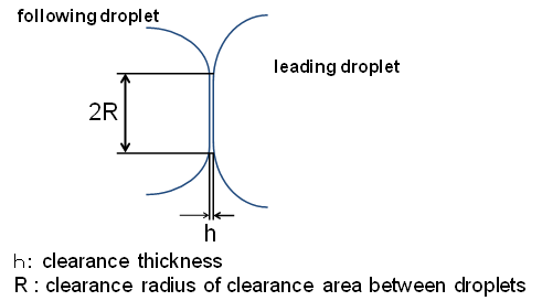 Based on the semi-theoretical formula of Aul and Olbricht [10], other semi-theoretical formulas for the coalescence time of droplets in a creeping flow through a tube have been proposed [11]. As shown in Figure 2, the clearance area between the leading droplet and the following droplet is assumed to be flat and discoid. Eq. (1) was derived from Reynolds’ theory of lubrication [13] under the assumption of two parallel-plane surfaces approaching each other.