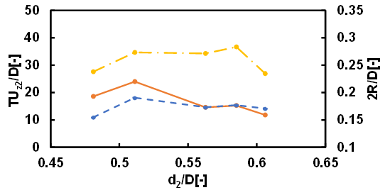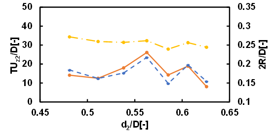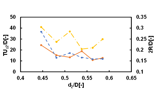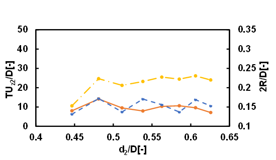 The motion of droplets rising in a quiescent fluid confined in a vertical cylindrical tube in the Stokes regime could be classified into three types: type 1 where both leading and following droplets rise almost straight, type 2 where the leading droplet rises almost straight while the following droplet undergoes spiral motion, and type 3 where the both leading and following droplets undergo spiral motion. In the case where d1/D=0.76 and the kinematic viscosity of the droplets is 30 cSt or 50 cSt, approximately 60% of the motion of droplets was type 1. The motions classified as type 2 and type 3 each accounted for approximately 20%. In the case where d1/D=0.68 and the kinematic viscosity of the droplets is 30 cSt, 15% of the motion of droplets was type 1, 10% of the motion of droplets was type 2 and 75% was type 3. When the size of the leading droplet was small, the difficulty of the mobility of the leading droplet due to the constraint of the cylindrical wall decreased, and the type 1 motion decreased and the type 3 motion increased. In the case where d1/D=0.68 and the kinematic viscosity of the droplets is 50 cSt, 36% of the motion of droplets was type 1, 13% of the motion of droplets was type 2 and 51% was type 3. When the size of the leading droplet was small, it is considered that as the viscosity of the droplet and the surrounding fluid increased, the mobility of the leading and following droplets decreased, resulting in an increase in type 1 motion and a decrease in type 3 motion. Figures 5 and 6 show the dimensionless coalescence times and dimensionless clearance diameter between the droplets as functions of the dimensionless undeformed diameter of the following droplet for different values of the kinematic viscosity of the droplets. d1/D was fixed at 0.76. T is the coalescence time, and R is the radius of the clearance area between the droplets. The solid lines represent the experimentally measured coalescence times. The dotted lines represent the semi-theoretical formula for the coalescence time, whereas the dash-dotted lines represent the dimensionless clearance diameters. The dimensionless coalescence time indicates how many tube diameters the two droplets travel during the coalescence time. The experimentally measured coalescence times for the droplets were in close agreement with the values predicted using the semi-theoretical formula. The trend for the clearance diameter was the same. Meanwhile, the effect of the clearance radius was greater than that of the hydrodynamic force, since the power of the clearance radius was much higher than that of the hydrodynamic force (see Eq. (12)).