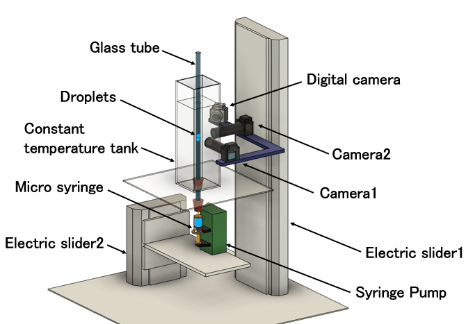 Figure 1 shows a schematic illustration of the experimental setup. A glass tube with an inner diameter of 3.5 mm, an outer diameter of 8.0 mm, and a length of 1500 mm was used as the test tube. The test tube was filled with a quiescent fluid which was a mixture of glycerol and pure water. The test tube was immersed in temperature-controlled water in a tank to maintain a constant system temperature. Silicone oils with kinematic viscosities of 30 cSt and 50 cSt were employed as the test fluids for the droplets. The viscosity of the droplets was equal to that of the surrounding fluid. Two droplets were injected into the test tube using a micro-syringe installed on a syringe pump placed in front of the tube inlet. The behavior of the droplets was monitored using three digital cameras placed on a sliding stage. The motion of the stage was electrically controlled to monitor the movement of the droplets through the test tube. The dimensionless undeformed diameter d1/D of the leading droplet was fixed at two values, 0.76 and 0.68, and the dimensionless undeformed diameter d2/D of the following droplet was varied, where d1 is the undeformed diameter of the leading droplet, d2 is the undeformed diameter of the following droplet, and D is the inner diameter of the test tube. The velocity of each leading and following droplet, the deviation from the tube central axis of each droplet and the coalescence time were measured. The diameters of the clearance area between them were also measured immediately before coalescence.