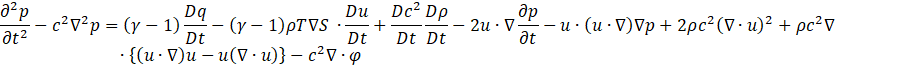 In this paper, we extend the formulation by also considering the source term due to small velocity fluctuations indued by the flow, based on the approach of Ikeda [9]. This second term is considered equivalent to the source term arising from fluid noise, as defined in the field of aeroacoustics by Klein et al. [10] and Toquard et al. [11]. The terms from the fourth and beyond containing (∇∙u)X', represent the source terms associated with flow divergence. Since this paper does not assume a system with external aerodynamic source terms, these terms are also excluded from the formulation. Focusing on the fluctuating components of various physical quantities, we derive the linearized wave equation, which is presented as Eq.7.