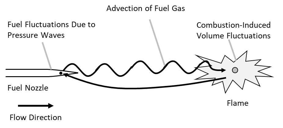 Combustion instabilities in internal combustion engines are considered self-excited oscillations that form a feedback loop, as shown in Figure 2.1. Figure 2.1 schematically illustrates the feedback loop between combustion-induced pressure fluctuations and fuel concentration oscillations, which is fundamental to thermoacoustic instability. The combustion inside the internal combustion engine generates acoustic oscillations due to the repeated expansion and contraction of the gas, which induces fluctuations in the fuel concentration within the nozzle. These fuel concentration fluctuations propagate downstream with the flow and, upon combustion, generate pressure fluctuations.