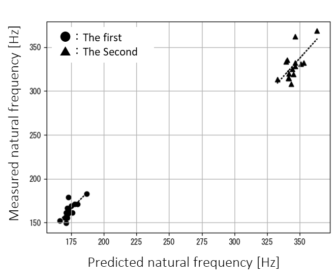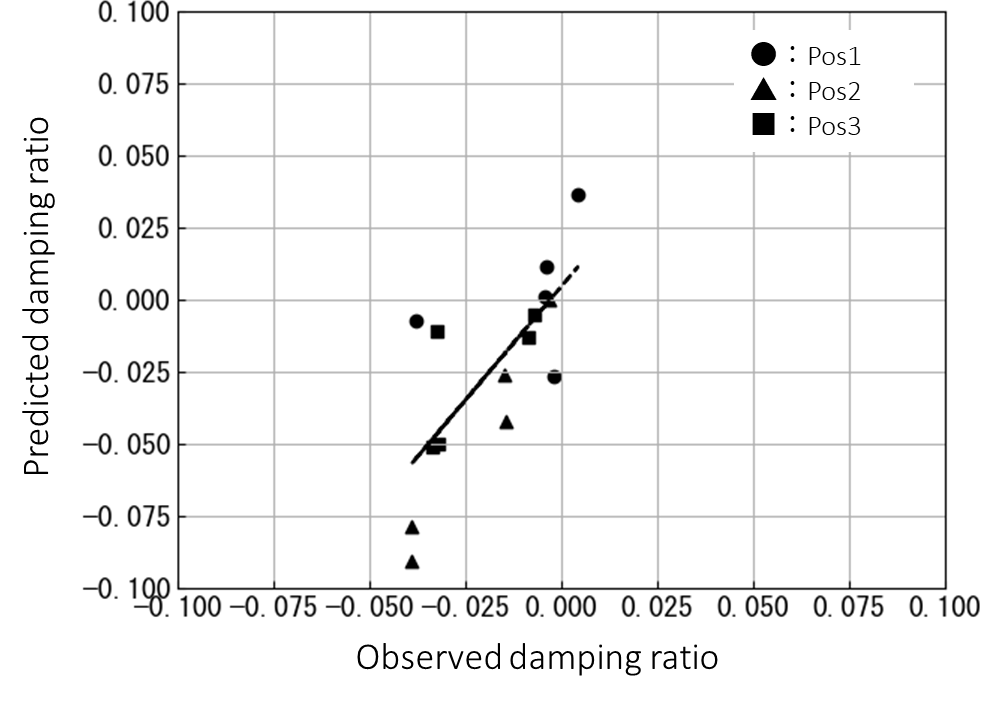 For all observed and predicted cases, the damping ratio was calculated for the dominant response mode, defined as the peak response below 500Hz (first or second mode). The results are presented in Figure 5.5. The vertical axis represents the observed values, while the horizontal axis represents the predicted values. The correlation coefficient between the two was found to be 0.73, indicating a generally consistent trend. These results demonstrate that the proposed analytical model is capable of reproducing the trend of combustion instability.