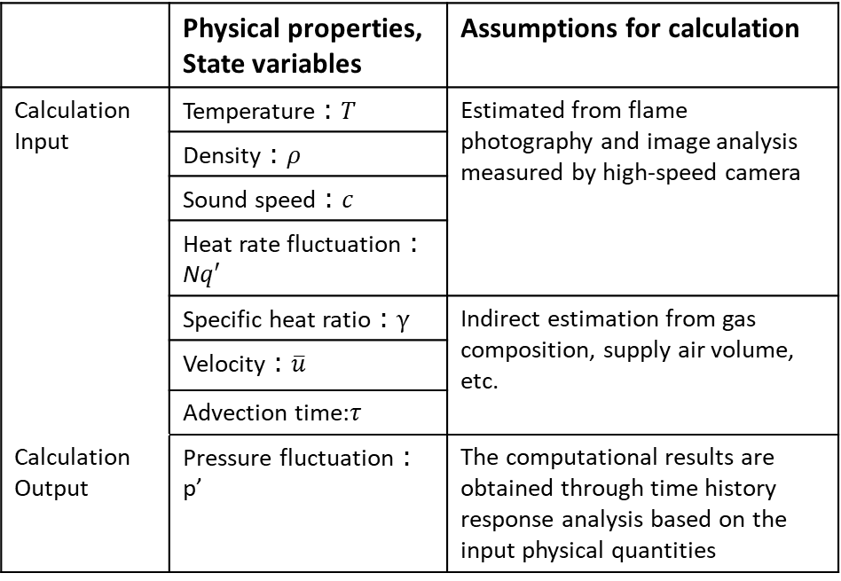The computational input was set based on the method shown in Table 2.1. Table2.1 lists the FEA input parameters, derived from flame imaging data to enable real-time capable, experimentally anchored pressure fluctuation predictions. The input for the FEA in this study was determined from flame image data captured using a high-speed camera, as described in Section 3.1. Specifically, the spatial distribution of temperature data was estimated based on the relationship between discretely measured temperature data and combustion image data, and various physical properties and state variables were calculated from the gas composition and temperature information.