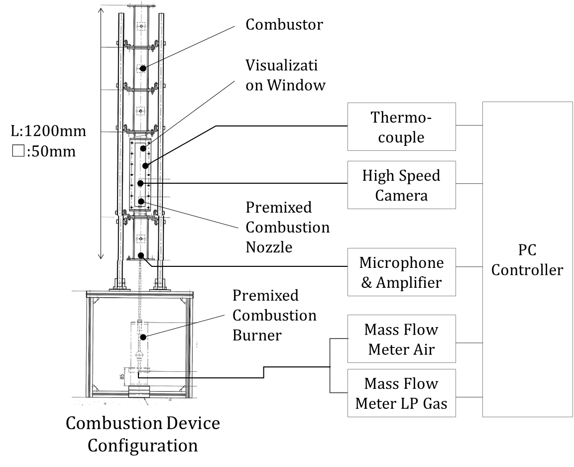 The experimental device used in this study is shown in Figure 3.1. In this experiment, a premixing nozzle equipped with a swirler was inserted into a rectangular cylinder with a base dimension of 50mm square and a length of 1200mm. Liquefied petroleum (LP) gas (main component: propane) and air were supplied to the nozzle using a mass flow meter. The combustion oscillation level was measured using a pressure fluctuation level sensor installed upstream of the combustion cylinder. This microphone can measure sound pressure levels of 30dB (10-3Pa) in the 4-70kHz range. As shown in Figure 5.1(Mentioned later), the maximum sound pressure level was defined as 148dB(410Pa) with a normalized sound pressure level of 1. Therefore, it is possible to measure a Normalized sound pressure level of 10-5 or less. As shown in Figure 5.1, the average value of the normalized sound pressure level under operating conditions with low combustion oscillation levels is on the order of 10-2. It can be said that this experiment has sufficient measurement accuracy.
