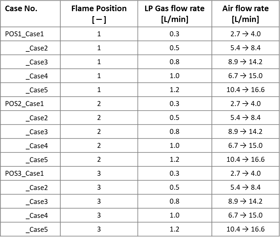 When obtaining the data under various combustion conditions, the combustion oscillation level and flame image data were obtained by keeping the LP gas flow constant while changing the air flow condition step by step as shown in Table 3.1.